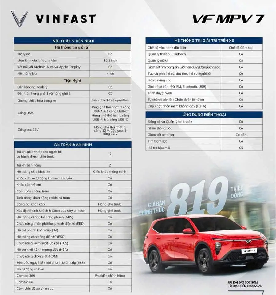 Theo kế hoạch, VinFast VF MPV 7 nhận cọc từ 20/1 đến 15/2 và giao xe trong tháng 2/2026. MPV 7 bảo hành chính hãng 7 năm hoặc 160.000 km cho xe và 8 năm hoặc 160.000 km cho pin (tùy điều kiện nào đến trước).